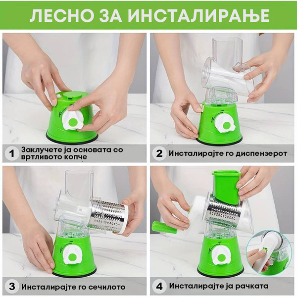 Ротирачкиот сецко е висококвалитетен, едноставен и лесен за употреба. Обезбедува побрза работа во кујната и можност да се посветиш на други работи.