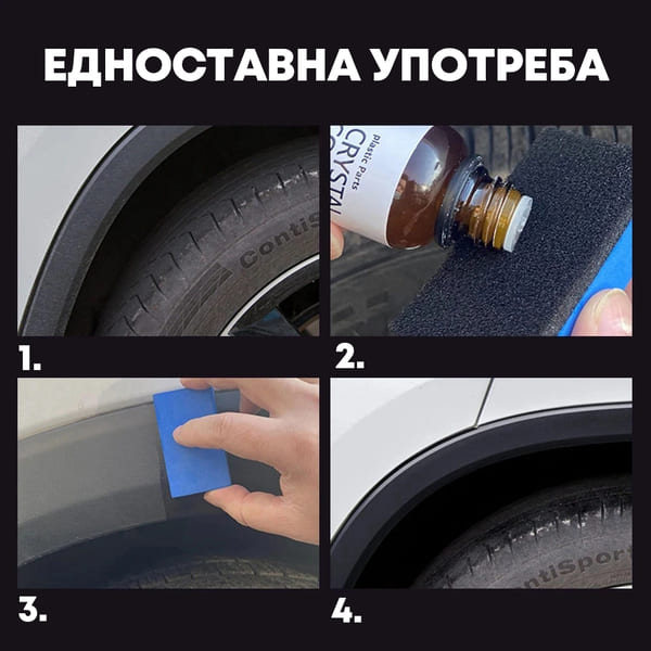 Прво добро се протресува шишенцето за да се соединат сите состојки. Потоа се користи апликатор или крпа и мала количина течност се нанесува на површината на пластиката во автомобилот што бара реставрација. По нанесувањето, течноста рамномерно се распоредува по површината со помош на апликатор или крпа.