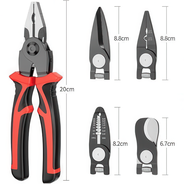Со едноставен механизам, само постави ја рачката во отворена позиција и брзо замени ја главата на алатот, што ти овозможува брзо прилагодување на функциите без да губиш време. Дизајнирана да одговори на различни потреби, оваа клешта е одличен избор за електрични поправки, градежни работи, како и за обични домашни задачи.