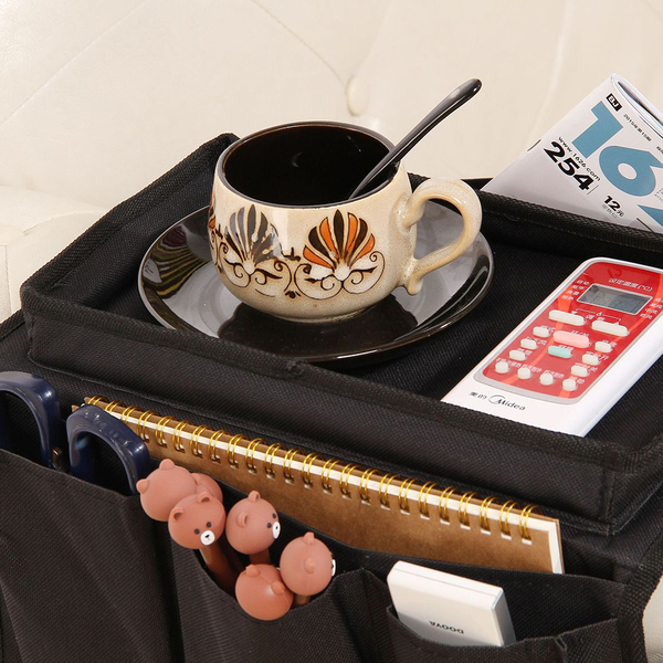 Лесно се поставува на потпирачот на твојата софа и го претвара во масичка со прегради.