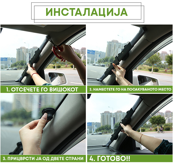 ✅ Прилагодлива ширина и висина - Работи на принцип како ролетна (истегнување) така што одговара на сите широчини на шофершајбната, додека висината можеш да ја прилагодиш со отсекување на вишокот со ножици.