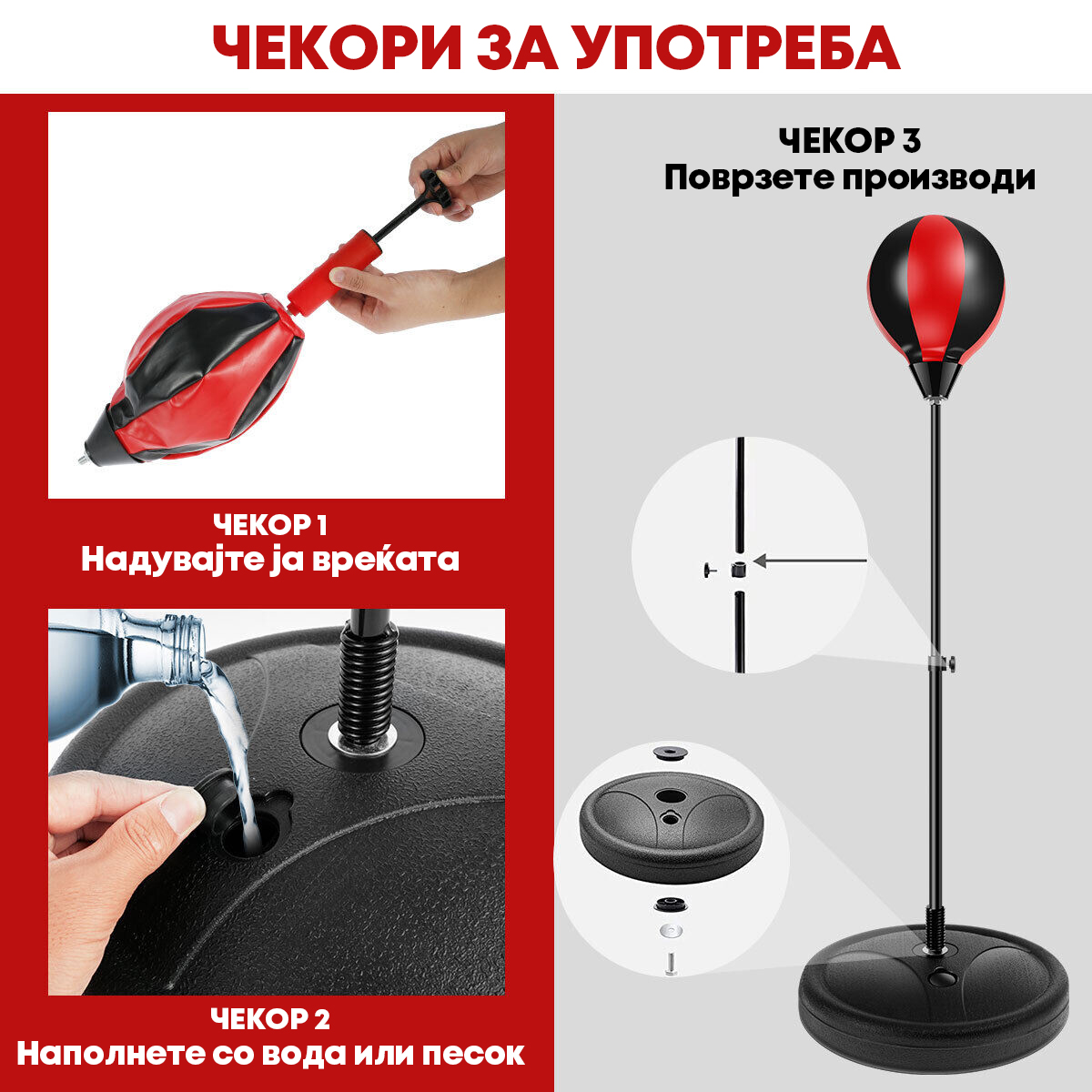 Комплетот доаѓа со сите потребни додатоци, вклучително и пумпа за брзо надувување. Склопувањето е едноставно, што ти овозможува брзо да ја поставиш вреќата и да им дозволиш на децата да го започнат своето боксерско искуство. Прилагодувањето на висината го олеснува прилагодувањето на производот на возраста на твоето дете.