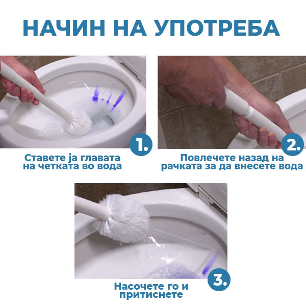 Користењето е едноставно! Повлечете ја рачката на четката за да го активирате распрскувачот, распоредете го чистачот рамномерно околу внатрешната страна на тоалетната школка, а потоа користете ја четката за темелно чистење. Брзо, ефикасно и без проблеми!