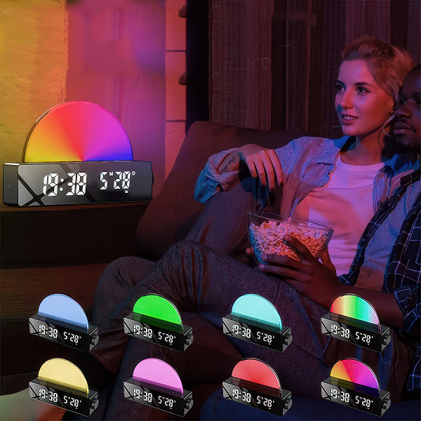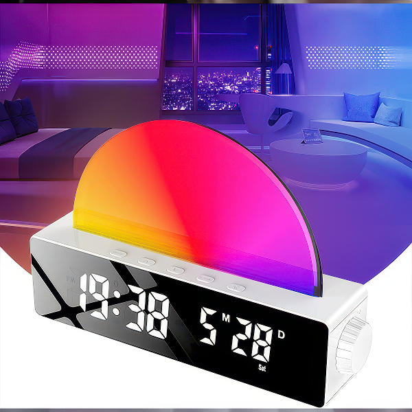 LED дигиталниот будилник е совршено решение за секој кој се бори да се разбуди наутро или има проблем да заспие. Дизајниран со симулација на изгрејсонце, постепено го зголемува интензитетот на светлината за да го имитира природното изгрејсонце, нежно будејќи те без шок од ненадеен аларм. Ова ти помага да го започнеш денот чувствувајќи се поосвежено и опуштено.