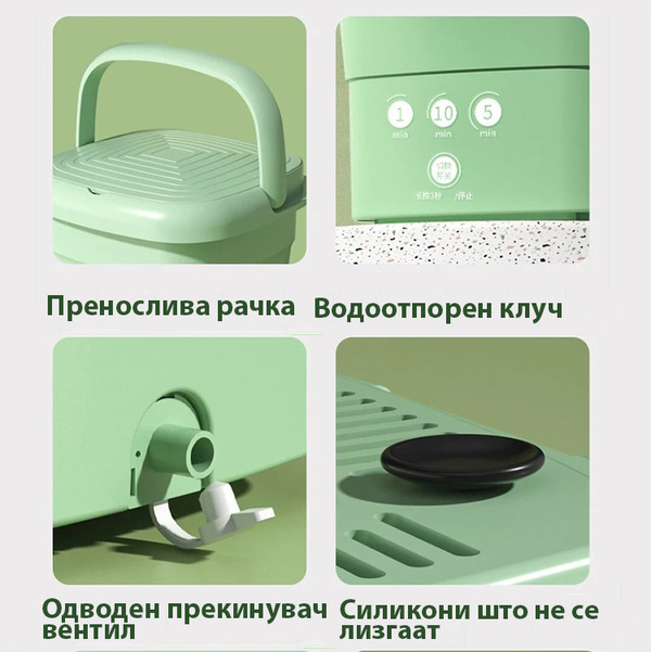 Овој пренослив уред е дизајниран да обезбеди брзо перење алишта без оглед на твојата локација. Благодарение на генијалниот дизајн на преклопување, машината за перење може да се трансформира во пренослива кутија, овозможувајќи ти лесно да ја носиш со себе. Без разлика дали патуваш, кампуваш или едноставно сакаш машина за перење што не зазема многу простор во твојот дом, оваа иновација е вистинскиот избор.