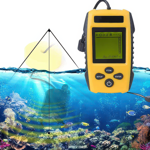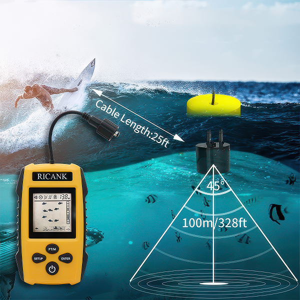 Пронаоѓачот на риби користи напреден сонар сензор кој ја детектира структурата на рибите и дното на длабочини од 0,6 до 100 метри, со јасен приказ на LCD екранот.