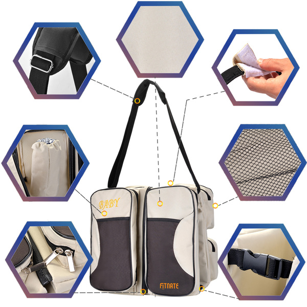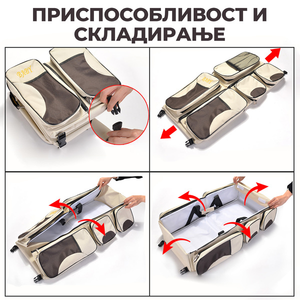 ✅ Приспособливост и складирање - Чантата може да се преклопи за компактно складирање кога не се користи и има повеќе прегради и џебови за организирање на бебешката опрема и личните предмети.