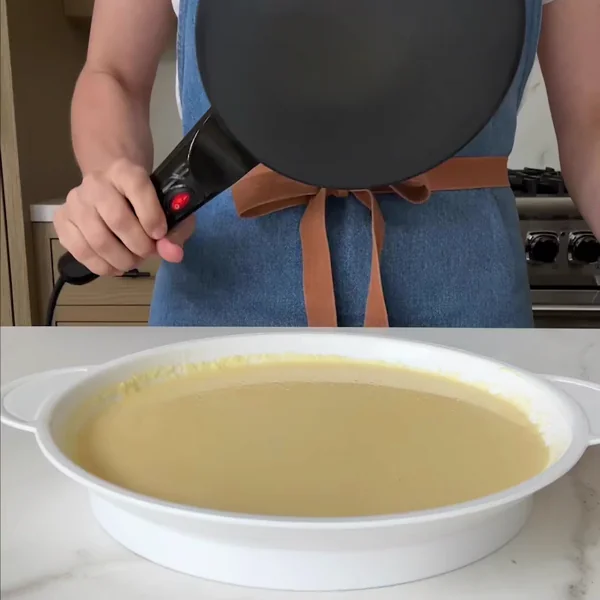 Едноставен Метод: Доволно е само да ја натопите тавата во садот со тесто – таа самата ја повлекува точно потребната количина за најтенката и најмека палачинка.