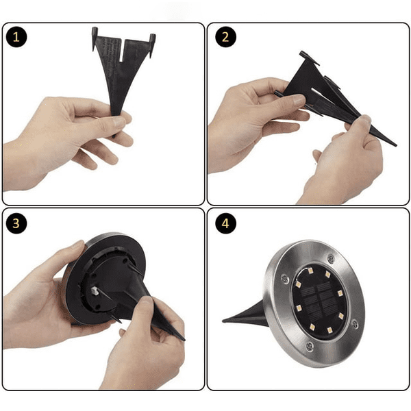 Сè што ти треба за инсталација доаѓа во пакетот - не се потребни дополнителни алатки. Монтирај го држачот на кружниот дел од светилката и забиј го во земја.